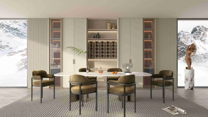 餐厅与厨房、客厅紧密相连,门墙柜一体化设计可以让空间更加融会贯通。将墙面与墙板合二为一,嵌入餐边酒柜,既能解决白墙的空旷感,又能为餐厅增添一抹雅致。餐边柜可根据家庭用餐习惯设置不同的功能区域,如餐具收纳区、酒水展示区、临时操作台等。柜体的颜色和材质可以与客厅相呼应,形成统一的整体风格,同时也可以通过局部的玻璃柜门或金属线条装饰,提升餐厅的时尚感和精致度。