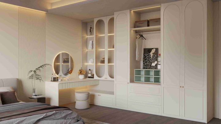 卧室是休憩的港湾,门墙柜一体化设计以舒适度为核心。衣柜是卧室的重要组成部分,通过门墙柜一体化设计,可以将衣柜与墙面、房门完美融合,打造整洁统一的视觉效果。衣柜的设计可以根据卧室的空间大小和居住者的需求进行个性化定制,如对于小户型卧室,可以采用衣柜延伸书桌的设计,既节省空间又满足办公学习的需求;对于大户型卧室,则可以设置独立的衣帽间,通过柜体的合理分区,实现衣物、饰品、被褥等物品的分类收纳。此外,柜体的材质要选择环保、隔音效果好的板材,为居住者营造一个安静、舒适的睡眠环境。